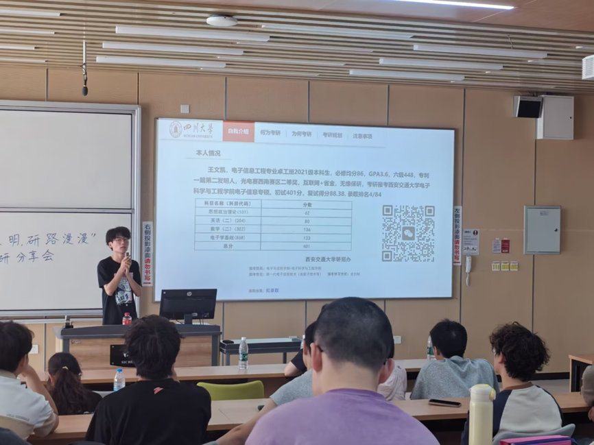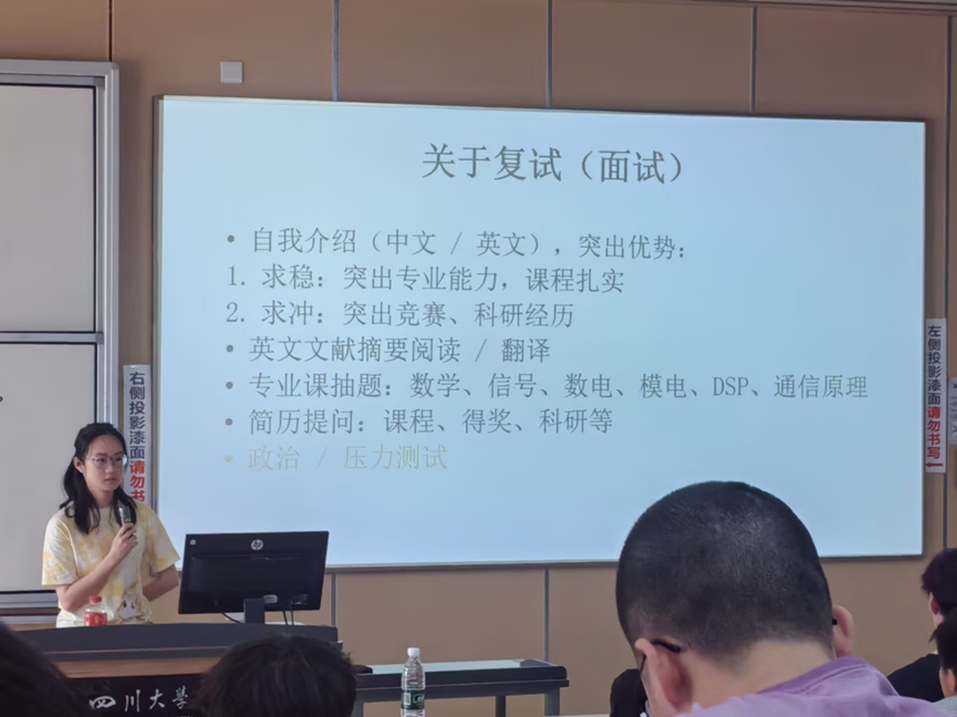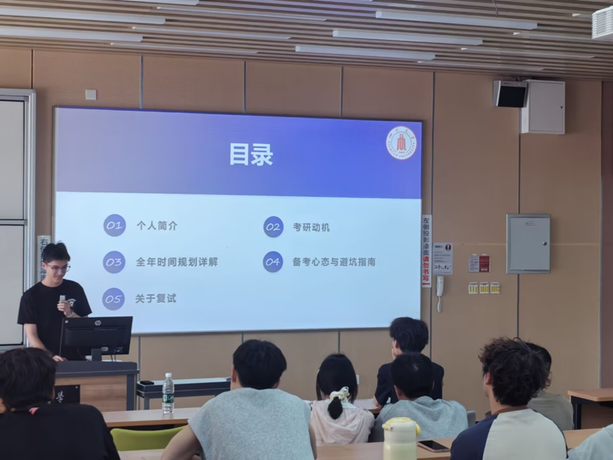 “星河长明,研路漫漫”考研分享会于5月24日下午在江安校区综合楼c105举办。本次分享会邀请了三名考研上岸的优秀学生分享经验,解答与会学生在考研学习中遇到的疑惑,帮助同学们理性规划考研院校和专业,提升考研技能。