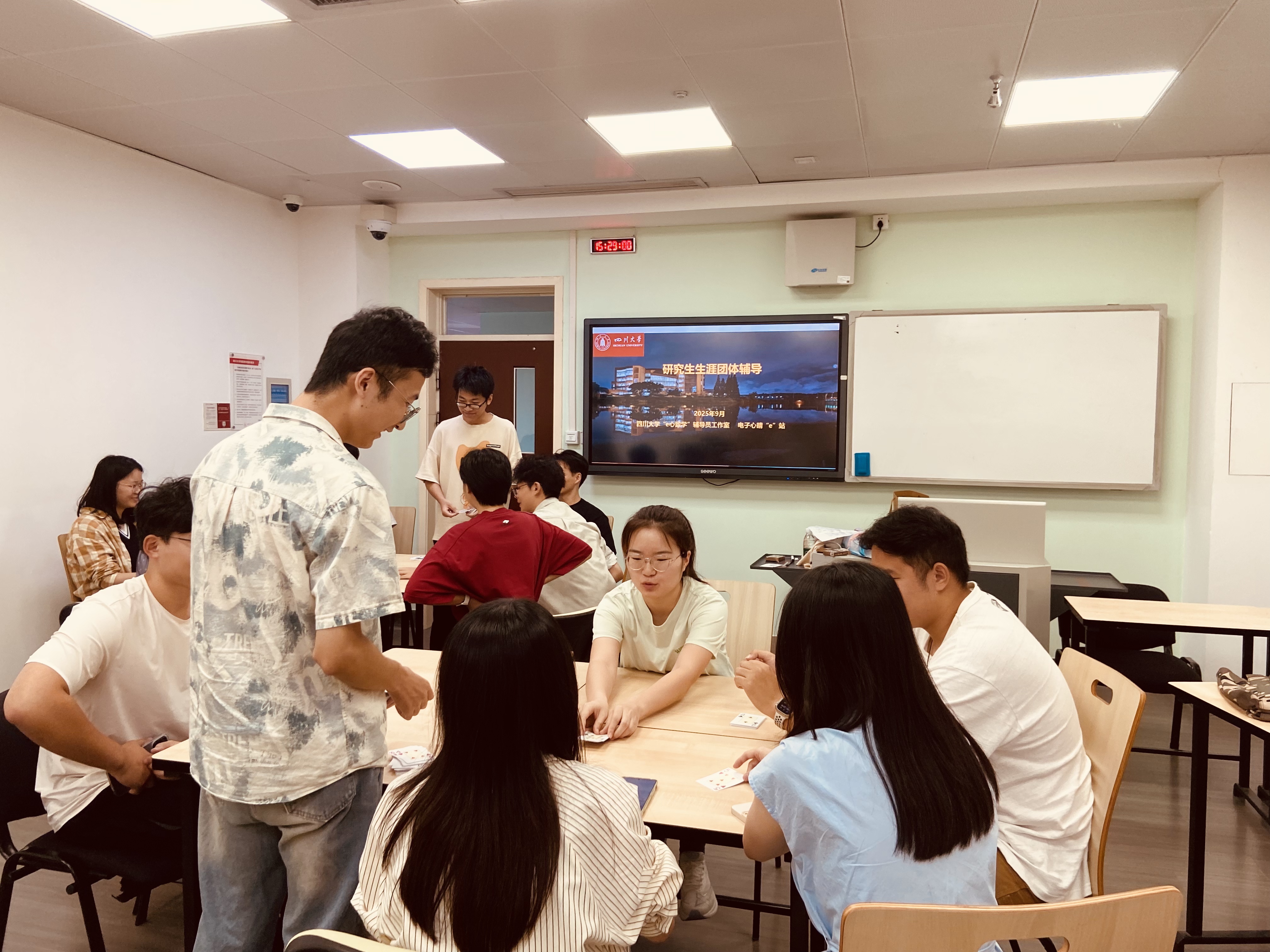 望江校区基础教学楼A503教室和A502教室顺利开展。本次活动由何惠老师指导,旨在通过轻松有趣的互动游戏和结构化讨论,帮助同学们缓解秋招压力、提升面试表达能力、增强团队协作意识与自我认知能力。