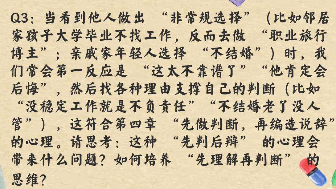 第五期读书会则承接第三章的阅读内容,将视角从对庞大的人类社会的探寻转向对自我内心的逐步剖析。与第三章相比,此次领读人的分享聚焦于个体,从对“自以为是”心理运作逻辑的解析到道德虚伪与认知偏差的科普,带领同学们将具有启发性的理论应用到打破偏见的实践中来。