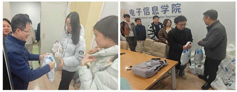 图 2学院领导彭书记、杨院长给同学们发放礼包