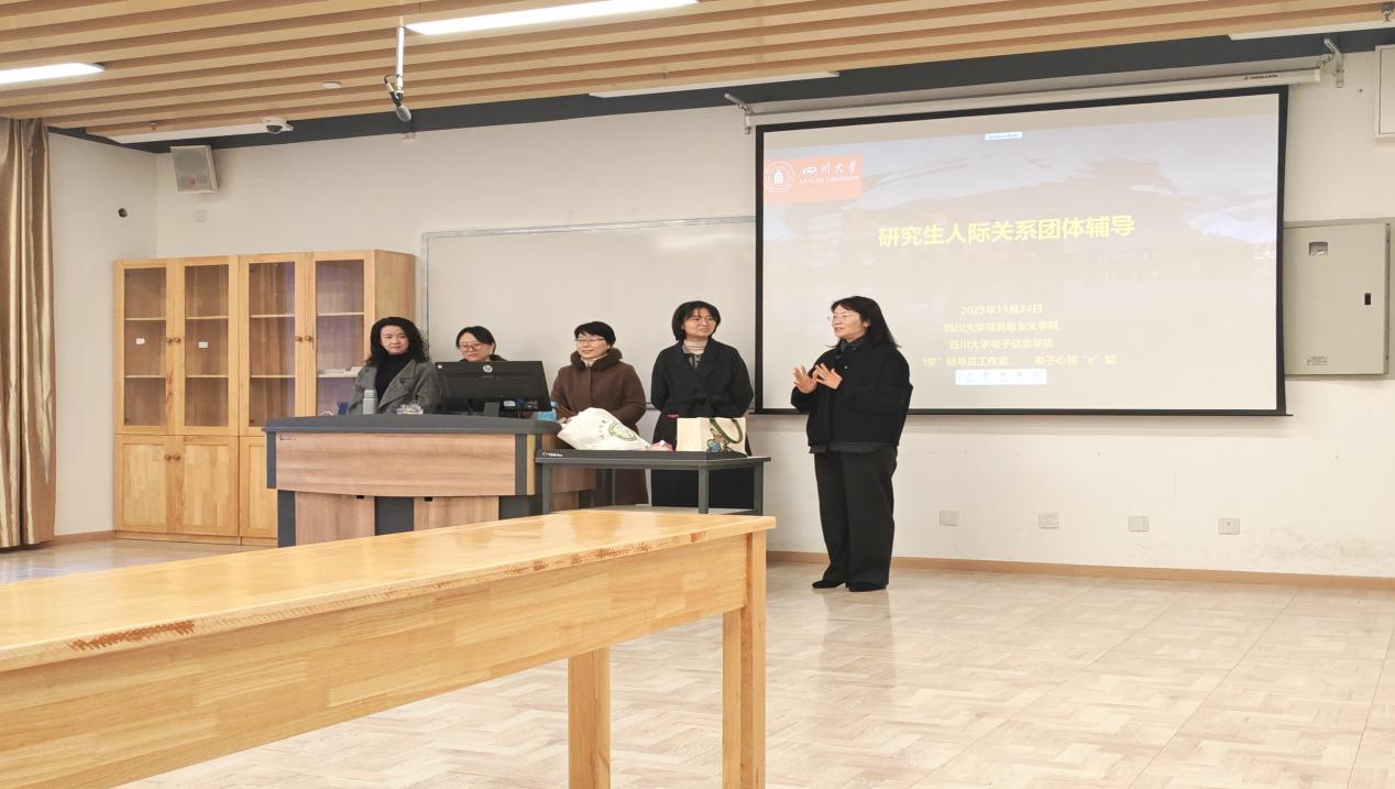 2025年11月25日,研究生人际关系团体辅导活动于望江校区顺利举行。本次活动由马克思主义学院研究生辅导员邢海晶教授主持,由何惠老师担任指导老师,由何阳、邹琴、杨焕老师担任辅助带领者,引导马克思主义学院博士研究生一年级的同学们经历了一场由浅入深、从陌生到共融的人际探索之旅。