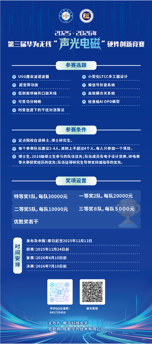 关于2025年-2026年第三届华为无线“声光电磁”硬件创新竞赛发布的通知//www.ese.uestc.edu.cn/info/5385/22693.htm