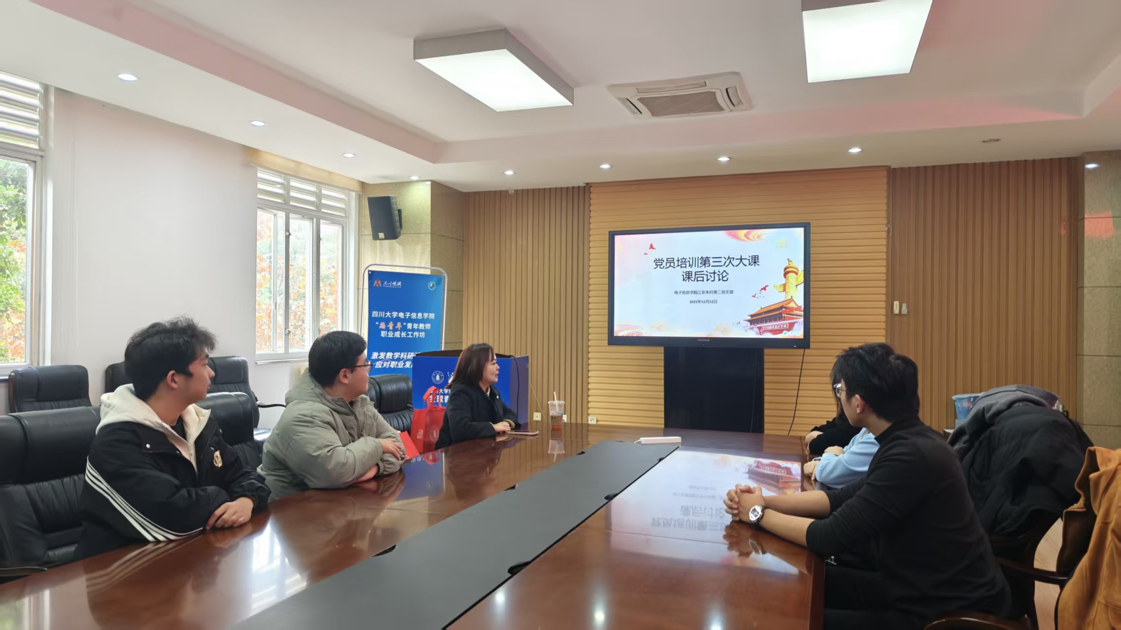 培训课程刚落下帷幕,江安第二党支部便趁热打铁,在基础教学楼A303开展了一场旨在深化学习成效、聚焦专业使命的课后讨论。活动旨在将党的创新理论与电子信息特色紧密结合,引导大家在思想碰撞中凝聚“科技报国”的共识。