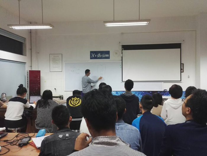 晚上7:20,活动正式开始。首先,大二的邱峻寅同学也就是本次授课的主讲人对来听课的新生表示欢迎。紧接着他就以富有趣味的语言向同学们讲解电子信息专业相关的知识和广泛用途以及日后同学们要学习的内容,内容包含以后将要接触的单片机以及电子元器件,有包含了一些电路信号处理方式。同学们都在认真听讲,遇到不懂的地方就会积极提问,邱峻寅同学也耐心的一一解答。还有一些其他的大二的科技园部长们也在行道里为新生们答疑解惑,教室里笼罩着一股学习的氛围。