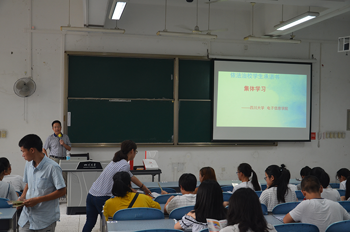 在此次宣讲会上,孟滋常老师给同学们讲述了依法治校的重要性,并告知同学们,一定要做一个遵纪守法的当代优秀大学生,那些违法违纪的事情不应该去做。接着,孟老师给大家发放了学生承诺书,让大家把遵纪守法时刻放在心中,做一个优秀的川大人。最后,同学们都十分积极的响应,并由老师收取了承诺书。