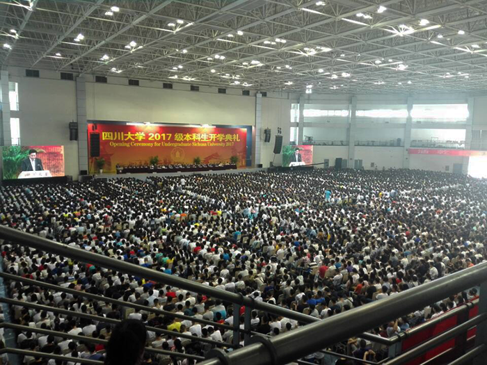 校长谢和平院士首先向2017级新生表达了诚挚的欢迎,然后以“成功始于自信,优秀源于自律”为主题,对在座的九千多名新生就大学生活和学习提出了新的要求。典礼上还有校友、教师代表和学生代表向新生们倾心分享了自己的故事。整个典礼上掌声不断,在场学生怀着喜悦的心情,望着台上多位尊敬的老师,认真聆听着他们的教诲。