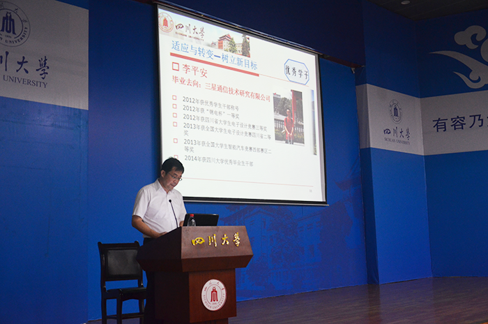 院长冯国英教授纷纷发表讲话。他们不仅向来自四面八方的新生们表达了诚挚的欢迎,还激励2017级新生不怕困难,勇往直前,发扬学院“自强不息”精神。教师代表、光电系党支部书记张启灿教授也上台讲话。他从学院学科建设和光电领域等多个方面,向大家介绍了电子信息产业前景。随后,优秀学生代表、2014级本科电子信息科学与技术专业汪志琴同学,2017级新生代表、电子信息类专业杨若雪同学分别发言。最后,小欧视频