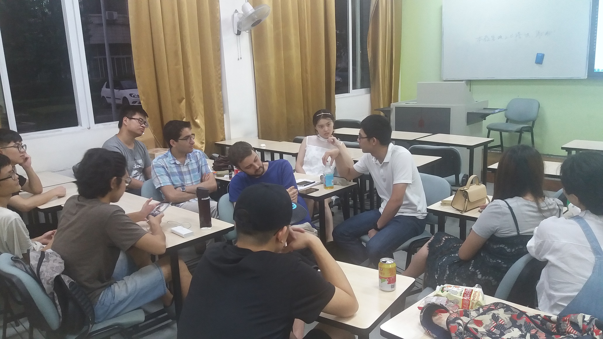 7月13日晚上7点,在望江校区三教107,参加交流营的中外同学结合自己的专业展开了相关学术论文讨论。在活动开始之前,突如其来的狂风暴雨并没有减少同学们对于参与此次研讨会的热情。研讨会的过程恰似这场雨可用“酣畅淋漓”来形容。