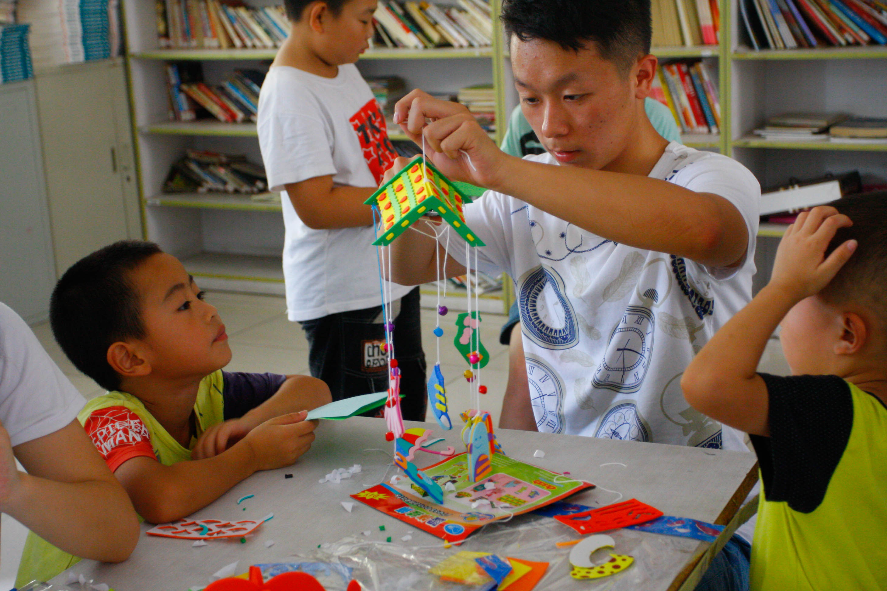 7月25日14:45志愿者到达成都市卡美多鞋厂,在厂区正门,由鞋厂吴老师热情接待了志愿服务队的同学们。首先由负责人杨斯涵每位志愿者分发了一套手工DIY风铃及剪刀、铃铛、双面胶等辅助工具,同时等待孩子们的到来,18位小朋友们与志愿者们自行组队。以互动课堂的方式由志愿者们帮助孩子们结合图片教程,手把手指导孩子们粘贴部件,穿接铃铛,在孩子们的认真制作、志愿者们的耐心帮助下,小朋友们陆续完成了自己的风铃,并热情地拿着自己的作品和志愿者们进行合影。随后志愿者开始教小朋友们折纸,纸鹤、蝴蝶、飞镖、青蛙、花朵等风格各异的折纸在小朋友们手中产生,孩子们热情高涨,纷纷表示想要多学习几种折法。在短暂却愉快的相处之后,全体志愿者和孩子们进行了合照,本次儿童爱心课堂之风铃折纸小课堂于17:50圆满结束。