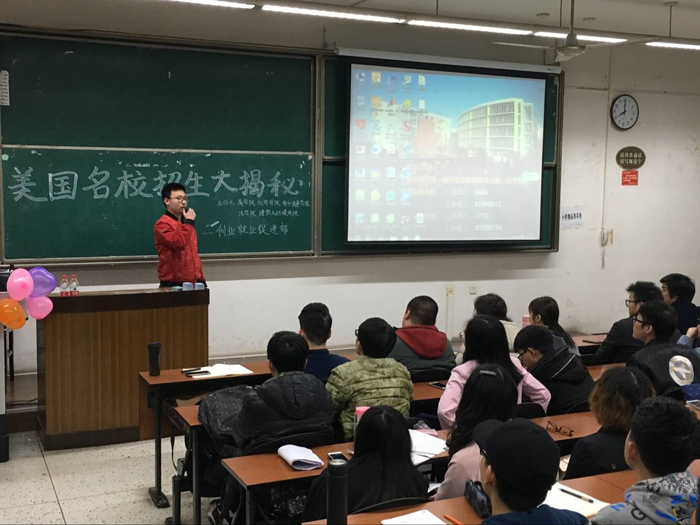 、建筑与环境学院、法学院、商学院五个学院的团委学生会创业就业促进部联合举办的美国名校招生大揭秘讲座在小欧视频