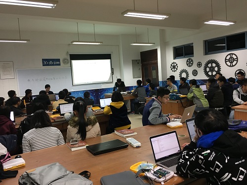 电子科技园的一员,同学们更应该掌握一些单片机技术。紧接着,主持人又简单介绍了此次单片机基础交流活动的目的是供同学们进行基础知识交流,共同探讨单片机的原理,用途等,让同学们了解到一个发光的单片机世界,提升编程技巧。随后,主持人宣布交流开始,电子科技园多旋翼飞行器第一组会长姜俊刚同学上台讲话,向同学们详细介绍单片机的发展与用途,建议同学们不要一味钻研书本,要多动手实践。随后向同学们讲解单片机的基本编程并让同学们用自带的电脑进行编程练习。期间同学们踊跃地举手向组长提出疑问,组长也耐心地给予解答。虽然在各个同学之前来回走动,解决各种各方面的问题,组长张倩同学和多旋翼飞行器(第二组)成员们虽然满头汗水却也带着充实而明亮的笑容。同学们也被他们所感染,更加用心的钻研起来。渐渐地,同学们已经学会自己设计荧光屏的显示。不知不觉中,同学们的自由练习时间结束。主持人致闭幕辞并宣布此次单片机基础交流会圆满结束,同学们虽然面带不舍却也热烈的鼓起掌来。