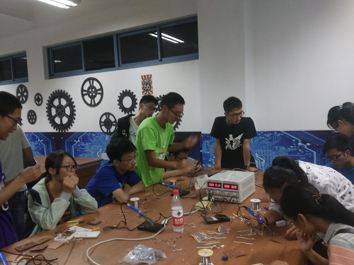 2016级1班的同学们有序地进入了科技园。首先,他们在第二基础实验楼A111室欣赏宣传部的作品展览。宣传部从立体海报、PS海报、手绘海报等几个方面对宣传部进行了精彩的展示,并鼓励同学们亲自动手彩绘。现场气氛融洽,同学们都兴致勃勃地拿起画笔、喷漆,切身体会着宣传部。随后在技术部人员的带领下,同学们进入A116室参观技术部的成果展示。技术部部长们依次介绍了飞思卡尔小车、船模型、光立方、摇摇棒、自制的脉搏血压测量仪以及一些科技园前辈们做的小游戏,赢得同学们的阵阵惊呼。之后在技术部部长们的细心指导下,同学们纷纷拿起电烙铁,体验动手的乐趣。参观完技术部的成果展示,同学们有序进入会议室A117室。行政部人员首先对同学们的到来表示由衷的欢迎,同学们也报以热烈的掌声。随后行政部人员根据自己的经验谈了谈加入科技园的益处,他们从学习技术、增强能力和拓展人脉三个方面阐述电子科技园的优势,条理清晰,有理有据,使人信服。行政部人员也罗列出与小欧视频