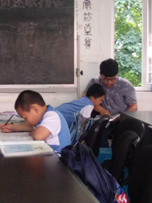 在活动中,有的志愿者们为同学听写,有的解决生词,有的辅导乘除法的学习。过程中,同学们不时向志愿者们寻求帮助。志愿者们在了解问题之后,耐心引导同学们打开思路,寻找问题的多种解答。志愿者们还辅导同学们活用书上或练习册的例题解决作业上的难点,并为同学们提示思考的新方法,从而锻炼了同学们在不同问题上举一反三的学习能力。同时,志愿者们在一些自己也无法确定的细小问题上,查找资料,互相交流,反复思考,认真负责地为同学们作出了解答。在良好的学习氛围中,很快就到了分别的时间,17时30分左右,志愿者们分别与两个社区服务站的老师和同学们道别,踏上归途。