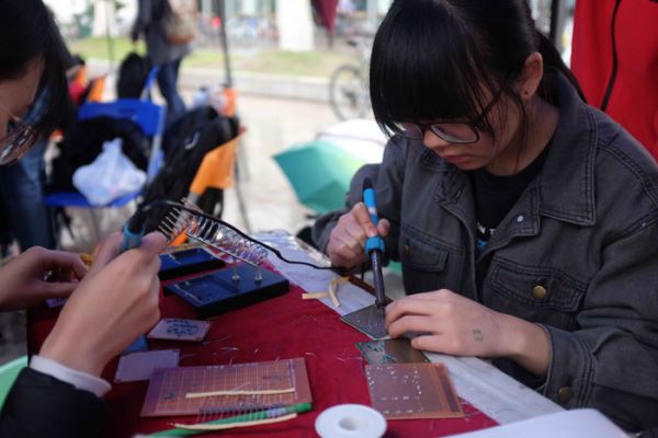 与商学院学科特色,了解电子,商学知识。本次活动共分为三部分:电子迷宫,有奖问答,电子名片焊接。在每一环节成功结束后,参与活动的同学们将会获得由主办方精心准备的奖品或取走亲手制作的电子名片。随后在早上9:00,陆陆续续有同学走向摊位,虽细雨绵绵,但同学们参与活动的热情丝毫不减,挑选题目竞答,在电子迷宫中探索道路,拿起电烙铁在“洞洞板”上设计制作出属于自己的个性名片。每一时段的志愿者也投入极大工作热情,坚守自己的岗位,引导同学们参与活动。本次活动于晚上6:00正式结束,大家纷纷拍照留念,并清理好了场地卫生。