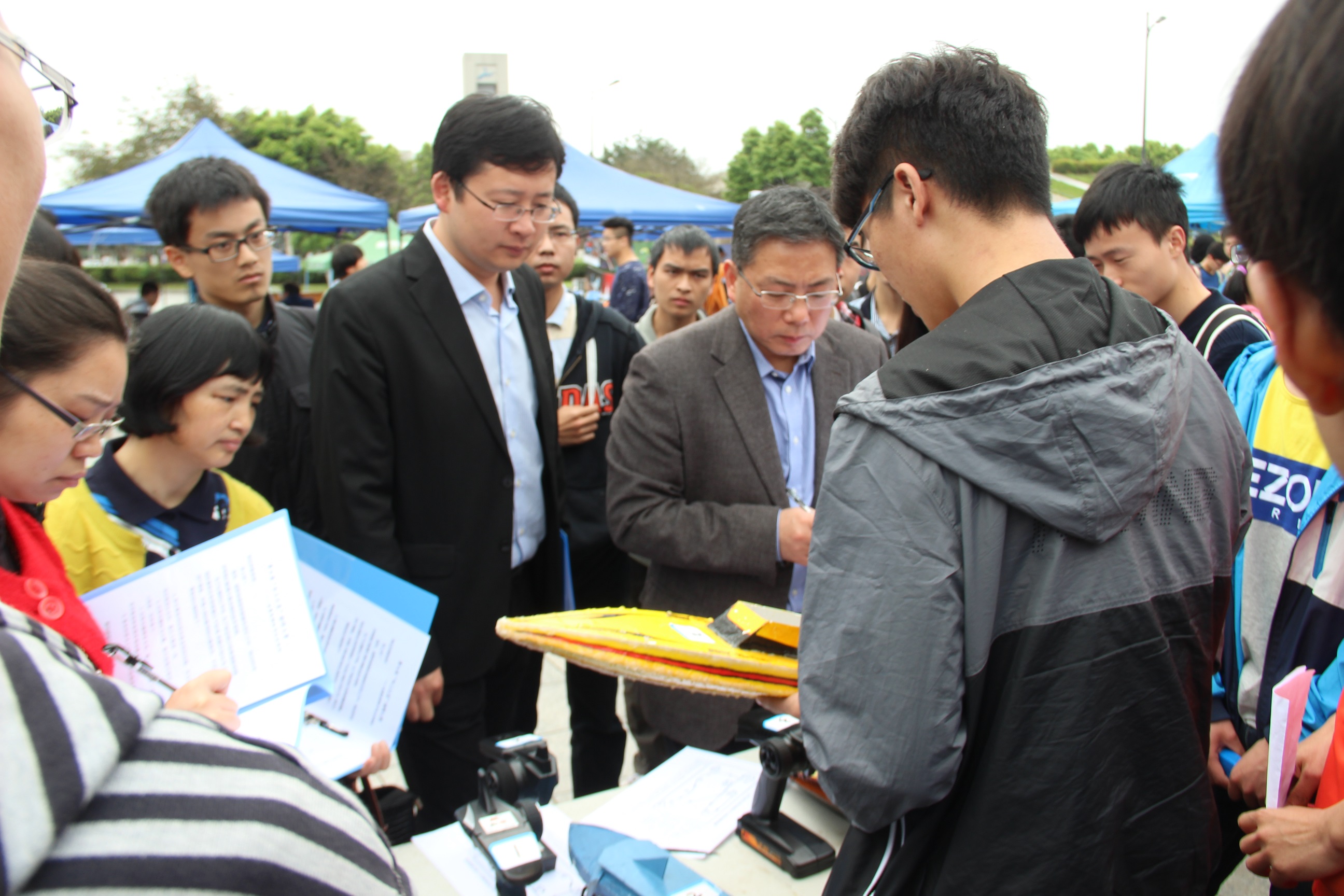 党委陈笃海副书记致辞,并宣布第七届“九洲杯·水上之星”船模大赛决赛正式拉开帷幕,将决赛的氛围推向高潮。在热烈的掌声中,由各位教授组成的评审小组开始对船模作品的控制模块、动力模块及整体结构设计等方面进行逐一评分,细致的问答不仅考验了同学们的知识水平,也锻炼了同学们反应及表达能力。答辩环节评比结束后,参赛选手们有序地前往景观水道进行最后的船只调试以及赛道试水工作。