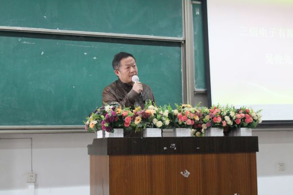 教育事业的感谢,再者,他告诫同学们应当珍惜校园里的教学资源并加以利用,多多积累专业知识,为今后的发展打下基础。接着由三信电子有限公司副总经理吴俊先生上台讲话。吴俊先生就三信公司的现阶段发展状况及对公司未来的预期向同学们作了简要的介绍,同时吴俊先生也表示,希望小欧视频