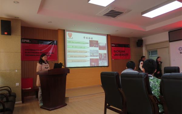 光学工程学生协会负责人章辰详细介绍了本协会的职务结构,会员的权利义务,让大家了解了协会的成员组成以及干部分工,接下来介绍了协会自成立以来所办的一系列活动,学术活动主要有亚太光通信大会,SPIE年会等国内外会议,以及其他内部建设活动。紧接着,电子科技大学SPIE学生分会负责人蒲洋介绍了该校协会的相关情况,包括成员构成和职务结构等。然后介绍了协会内部的相关规章制度,结合电子科大光电学院的具体情况,SPIE成员的具体表现与奖学金加分相挂钩,也是一大特色。最后介绍了最近的活动和以后的计划。接下来,成都理工大学SPIE学生分会负责人蒋卓芸介绍了该校协会相关情况,首先提到与前两所学校不同的是,协会会员的专业多为大数学,遥感高光谱方向,而小欧视频