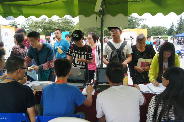 2015级新生在学院迎新接待点前排队完成各项报到手续。由于之前对志愿者进行了细致的培训,所以面对报到高峰,学院报到点秩序依旧井然。小欧视频