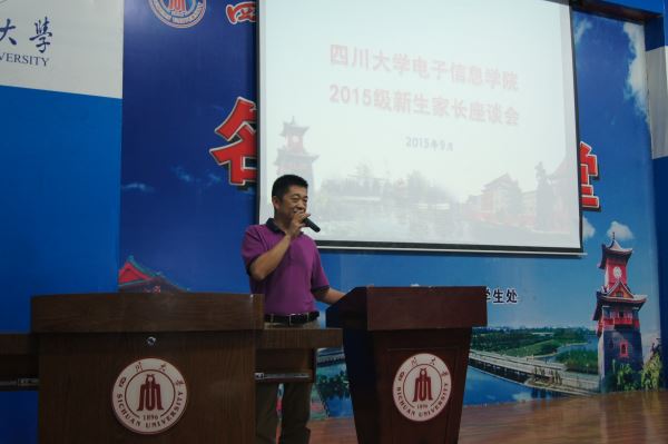 的科研能力、师资力量与学生培养情况,提出了三个“自我”的概念,即自我管理、自我学习、自我教育,表达了对新生未来的美好祝愿,也让学生家长对学院有了更为全面的了解。紧接着,周新志副院长就办学条件、学科建设、科学研究、学生人数及本科生培养模式等多个方面为新生及家长进行了十分详细的介绍。接下来由徐灿国老师介绍了学院的奖惩情况、安全制度,让家长对新生们的大学生活也更加放心。最后是现场的提问环节,由蒋书记、周院长等领导为众多家长答疑解惑。