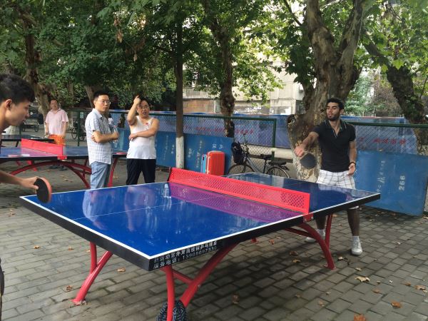 一行人来到望江校区有乒乓球台的场地,首先由中方的学生做示范,大家很快就进入了状态。两个外国学生学习地十分认真,其中Ghali热情高涨,进步很快,很快就把球玩的比较熟练了。他不仅和组内成员切磋,还和球场上其他高手切磋。两个外国学生在此行中学到了很多打乒乓球的技巧。球场上笑声,欢呼声不断。