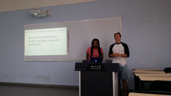 国际交流营第三组的同学与美国留学生Nicola和Conner一起开展了以歌曲舞蹈为主的艺术话题的交流。第三组的同学借用了一个教室,依托教室的多媒体设备,展现了自己的才艺,同时也交流了不同的文化。