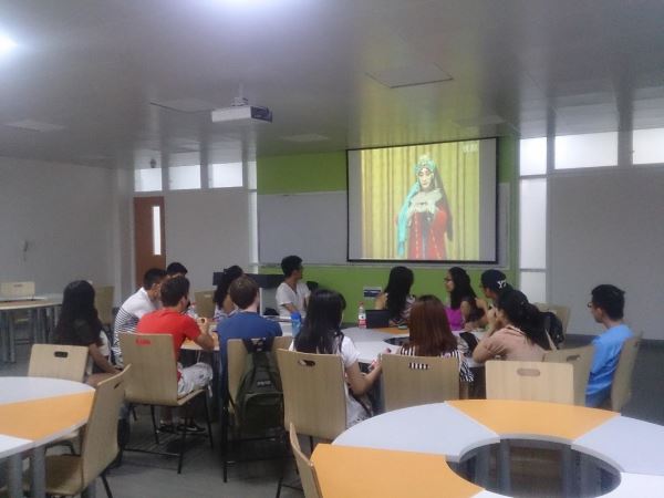 同学摘取了古代文化中的服饰,建筑,京剧等极具代表性的中国古代文化符号向国外同学展现中华文化的博大精深。在现代文化方面,大家则从音乐、影视剧以及饮食等方面结合影像资料向国外同学展示了丰富多彩的现代中国文化。在此期间,大家还相互交流了中美法各自的校园生活,包括运动照片,生活经历等。此后,小欧视频
