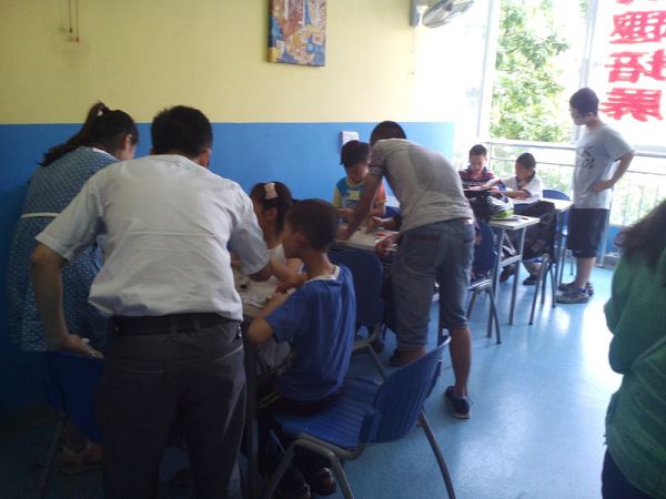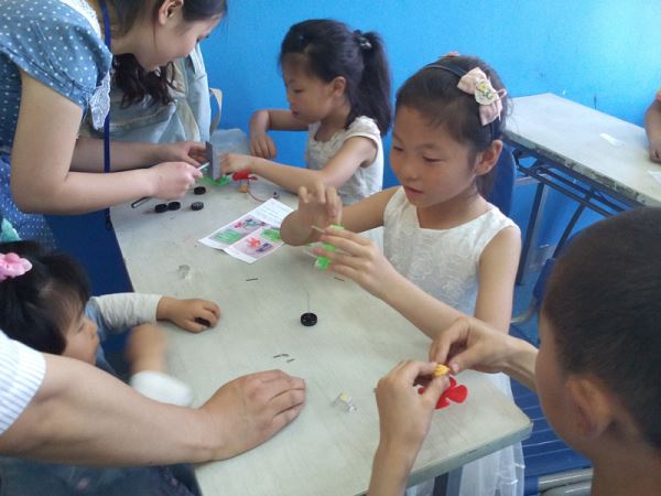 首先,一名志愿者讲解了电动小车的原理以及如何制作电动小车。经过简单介绍后,志愿者将同学们分小组发放小车,每一组指派一名志愿者,负责解决制作小车过程中可能遇到的问题。制作小车时遇到了不少问题,模型的洞与小杆尺寸不合,只用手很难轻松安装。幸好在事先准备时志愿者就发现了这个问题,携带了小锤用于制作,并对之进行了严格管制。有的小组组装小车时遇到了损坏风扇或电机无法启动的情况,这时志愿者用多出来的小车零件进行替换。有的小组很快完成了小车,并进行了创新,将两辆甚至三辆小车组合在一起,使小车变大车,并取得了成功。当所有小组制作成功后,时间已到了16点整,活动接近尾声。打扫场地后,志愿者们离开了青空。