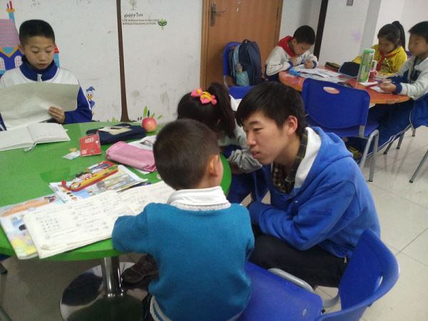 不少同学快速地完成了课后作业,交由志愿者们检查。志愿者们细心地为同学们检查作业,标出不正确的地方,并耐心地为同学们讲解。可能由于刚刚下了一场太阳雨,有些同学们比较浮躁,不能静下心来学习,不断地调皮捣蛋。然而志愿者们并不灰心,循循善诱,使同学们渐渐恢复了耐心并开始专注地写作业。当同学们的作业基本完成后,志愿者们分年级给同学们听写,并教孩子们造句。