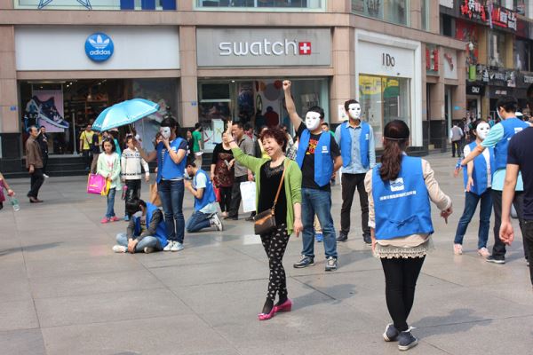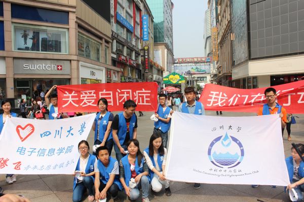 4月1日早上8点10分,16名志愿者乘车到达环球中心进行活动准备。在和相关工作人员商量好场地事宜后,8点50分哨声响起,志愿者穿上蓝色马甲,带上面具,以吹哨人为基准排好队形,瞬间定格成塑像姿势静止不动。两分钟后,哨声再次响起,志愿者拉开准备好的横幅,齐声喊口号—“关爱自闭症,我们在行动”。结束后散开到指定地点集合。9点20分乘坐地铁前往天府广场,10点整定格快闪三分钟,结束后乘二号线到春熙路。11点整在春熙路的定格快闪迎来了很多路人的围观,在相关安保人员的协助下,顺利地完成了最后一个地点的快闪。随后,志愿者们有序地离开,乘车返回学校。
