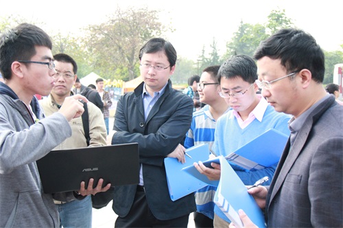 副院长周新志教授宣布第六届“九洲杯·水上之星”船模大赛决赛拉开帷幕。在热烈的掌声中,由各位教授们组成的评审小组开始对船模作品的控制模块、动力模块及整体结构设计等方面进行逐一评分。评比结束后,参赛选手有序前往景观水道试赛道。