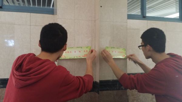 大一大二的全体学生征集“世界水日”节水标语,同学们均积极参与。志愿者们将收到的节水标语整理后,选出优秀标语并排版打印。3月21日上午9点整,志愿者们前往江安校区第二基础实验楼并在其所有的洗手间贴上了统一的节水标语。12点10分,志愿者们对江安校区的洗浴中心进行了节水标语的张贴。12点40分,此次志愿活动在志愿者们的努力和配合下圆满结束。