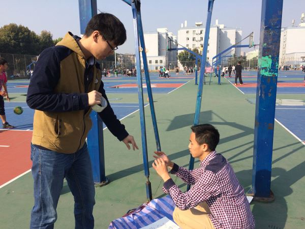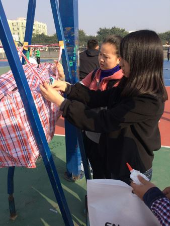 三号体育场大门口集合并开始活动。志愿者们拿出已经准备好的编织袋、挂钩等材料,在篮球架上量取适宜高度后粘贴好挂钩。紧接着志愿者们将已经修改的回收袋安装到挂钩上,并用打孔器在袋子四周进行打孔以防下雨或者塑料瓶中仍有的残留液体流出造成回收袋承重过多。随后,为了让同学们更清楚地了解回收袋的用途,志愿者们在袋的外侧张贴标语,同时也进入场地向同学们进行宣传。10点半许,在志愿者们一个多小时的努力下,回收袋全部安装完成,本次活动也顺利结束。