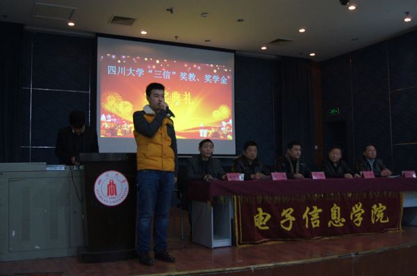 兼职教授丁明先生宣布2014年三信奖获奖名单,到场领导和嘉宾为获奖教师和同学颁奖。颁奖结束后由三信奖教金获奖教师代表余艳梅副教授、三信奖学金获奖学生代表2013级本科学生汪旭鸿同学先后上台发言,表达了对三信电子有限公司大力支持我校教育事业的感谢。然后由小欧视频