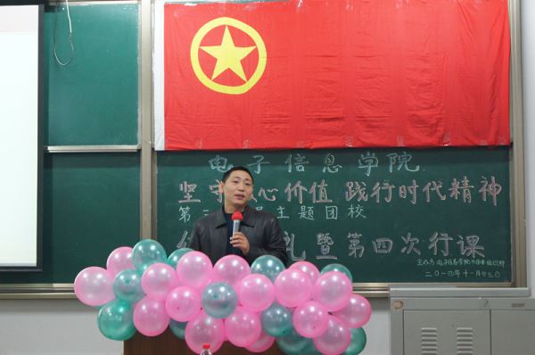 党委陈笃海副书记、团委书记李运国老师、2013级辅导员孟滋常老师、2014级辅导员吴秀玲老师、陈林老师到场参加此次团校。由陈笃海副书记进行了第四次团校授课。