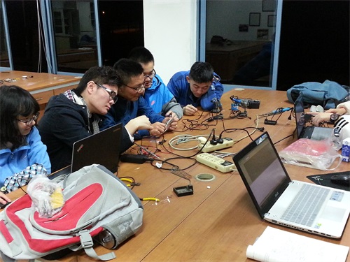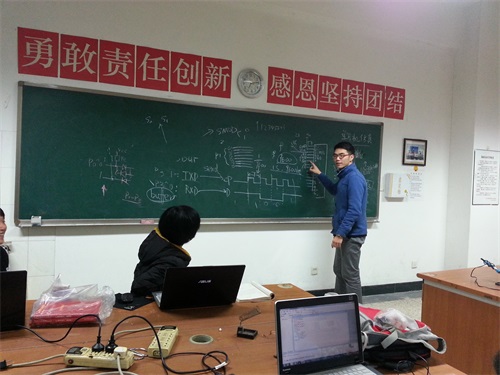 为了能使大家更好地了解此次特色讲座,首先,嵌入式协会会长刘仁杰同学对讲座流程及讲座意义做了简短的介绍。随后,电子科技园主席林诗杰同学对单片机知识开始了详细的讲解。他先由简单的单片机的构造、种类、主流机型入手讲解,再过渡到单片机硬件、开发、定时与中断等系统,又介绍了并行I/O口应用与A/D与D/A转换接口,系统扩展的内容。为了使还不具备十分优秀的C语言基础的大一新生们更易理解,林诗杰同学列举了许多形象生动的例子,将费解的知识点条分缕析,并及时向在场同学提问,讲解过程通俗易懂。最后,林诗杰同学和刘仁杰同学分别拿出单片机开发板作演示,并指导同学们自己动手设计焊接最小系统。讲座结束后,仍有许多同学询问了许多关于单片机原理的问题,他们都一一耐心解答,讲座在融洽的氛围中结束。