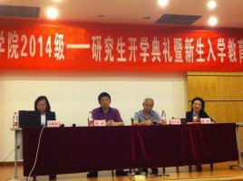 首先蒋斌书记上台致欢迎辞,希望同学们能尽快适应研究生角色,同时也希望同学们在研究生阶段首先要学会做人,做一个学术诚信的人,做一个心理健康的人。他的讲话让同学们对研究生学习及生活有了更深入的认识,也更有信心迎接未来的研究生生活。接着学院教师代表、博士生导师张彬教授讲话。张老师向同学们分析了研究生与本科生的不同,督促同学们要制定远大的志向并且对研究工作要坚持不懈地努力。通过她的介绍,同学们对未来的方向又清晰了许多。最后,2013级博士研究生代表王树桐同学向在场的新生分享了自己的求学经历,鼓励他们要多动手,并强调要多去锻炼自我的社交能力。2014级硕士新生代表冯丹同学则表达了对即将开始的大学生活的期待,并提出学习上的问题及建议与同学们共勉。