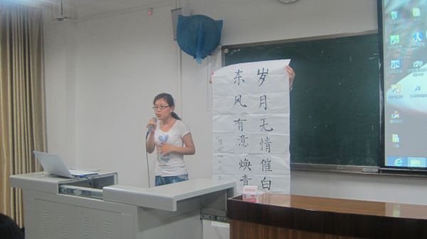 分团委学生会女生礼仪部主办,共有5支队伍参加比赛。比赛前,主持人详细讲解了比赛规则。紧接着便是最为精彩的环节——自主展示。首先上场的三个班的作品都是视频,其中,3班以大家耳熟能详的公益广告的拼接为创意,并在视频的结尾加入了同学们对自己父母的认识,6班则以精美的动画表达了他们对人的一生的看法,7班的参赛选手则将他们与父母的一幅幅温情的照片做成了感人的视频。第四位上场的1班,他们给大家带来的是原创诗朗诵,充满感情的朗诵将现场的气氛带入了高潮,同时也赢得了热烈的掌声。最后上场的2班以传统的书法为表现形式,配以适当的讲解,别出心裁的创意得到了观众的阵阵好评。最终,1班获得一等奖,2班和6班获得二等奖,3班和7班获得了三等奖。