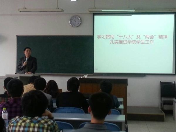 的年级干部、社团干部深入了解“十八大”及“两会”精神,提高思想觉悟,更好地为广大同学服务。上午10时大会准时开始,首先由李运国老师向大家介绍了本学期的重点工作,并鼓励同学们积极参加“挑战杯”等科技学术竞赛,提高专业水平和动手能力。接下来由陈晓娟老师提出了对学生干部的几点要求,提出本学院的学生工作要独具特色,形成以学风促进班风的良好状态。徐灿国老师向同学们介绍了学院党建工作的特点和要求。紧接着陈书记详细阐述了“十八大”及“两会”精神的内涵,提出学生干部在学习中要起到带头作用并积极开展具有学院特色的实践创新活动。最后,陈书记表达了对学生干部美好的祝愿,本次培训会在热烈的掌声中圆满结束。