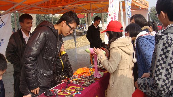 本次活动主要由“腾飞”青年志愿者服务队宣传,给有损坏小电器的同学通知与宣讲,然后由电子科技园的技术人员对在维修范围内的损坏品进行维修。早晨9点,两个部门的干部就在青广上建起了一个街边小维修站,并且不断向来往的同学宣传此次活动。之后,陆陆续续地,就有好几位同学拿着打不开的台灯、用不了的鼠标、耳机和计算器跑来维修。于是值班的干事细心地为维修品一一做了标签和登记,然后交给电子科技园的同学们进行维修。在使用换灯管、万用表等多种方法后,他们判断出了电器损坏位置以及维修了在自己维修能力之内的电器。