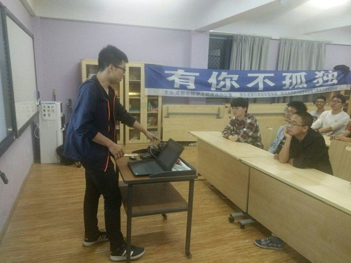 本次活动共分成两个小部分来进行。首先,志愿者在参与活动的同学到来之后,开始了第一个部分:以自闭症为主题的演讲。主持人首先在台上向在场的同学简单的介绍了自闭症的相关信息,随后,参与演讲的志愿者便一一上台,就自己对于自闭症以及“蓝色贵族”的了解与感悟,发表了演讲,同时也对自闭症的相关知识进行了介绍,向在场的同学普及了有关于自闭症的知识,号召同学们更多的去关怀自闭症患者。在此期间,不断有同学提出问题,志愿者们也一一进行了解答,让同学们更深入得了解了自闭症。