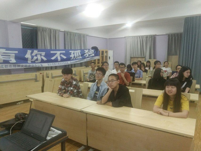 在演讲结束之后,志愿者们便开始带领同学们进行活动的第二个部分:“打开心锁”卡牌游戏。志愿者们首先给同学们讲解了游戏规则,之后在确保同学明白了游戏规则的前提下向同学们分发卡片,开始游戏。在游戏过程中,志愿者会不时的指导同学们,同时也不断向同学们渗透关于自闭症的知识。同学们在每轮游戏的发言中也都直接或间接的表达着对于自闭症患者的祝福或关心。在活动结束后,志愿者也引导同学们在今后生活中更加关心自闭症,并留下了合影留念。