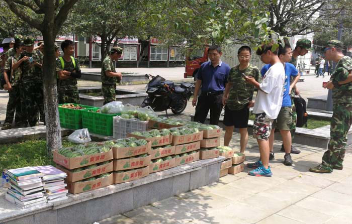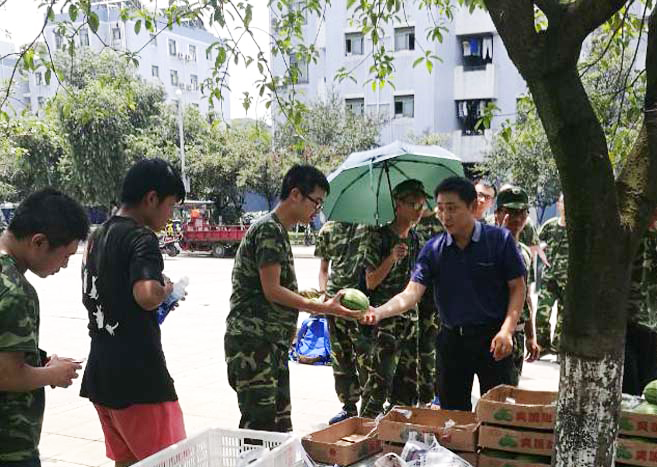 于江安校区三八广场和西园十一舍组织为军训的同学们分发水果。小欧视频