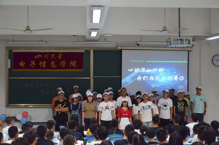 晚上7:00,宣讲会正式开始。电子科技园是在团委学生会之后宣讲的。但与学生会不同的是,科技园是以一段科技成品的展示来开场的。讲台前灯光暗淡,唯有科技成品的灯光在闪耀,或明或暗,色彩斑斓,画面十分壮观!前来参加宣讲会的同学们都被眼前的画面给深深吸引住了,这场表演无疑也提升了新生们对科技园的好奇。表演过后,科技园的主席团上台向同学们介绍科技园的特点,职能,以及一些举办过的优秀活动等等。这之后便是科技园各部门介绍自己部门的特点,呼吁大家加入科技园。最后,科技园全体成员上台一齐高喊:2018,我们在科技园等你!科技园以这种方式结束了此次的宣讲会。