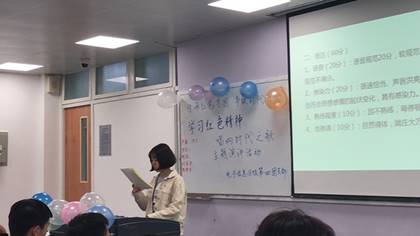 于2018年11月3日举办了以“学习红色精神,唱响时代之歌”为主题的团日活动。活动中,所有成员分为几个小组,各小组发言代表人分别按顺序上台进行主题演讲。