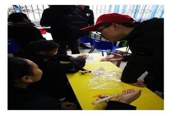 志愿者在帮助小朋友解决组装中遇到的问题 |