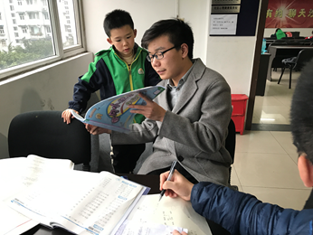 志愿者们怀着紧张激动的心情走进社区活动室,紧张的是害怕不能解决小朋友们的问题,激动的是又能替孩子们处理学习中存在的问题了。志愿者们刚推开活动室的门就发现早已有几个小朋友等候在活动室里面了,这几个小朋友早早地就准备好了各种问题,活动刚开始,这几个小朋友就拉着志愿者提各种问题,志愿者们也一一回答了他们提出的各种天马行空的问题。随后其他小朋友也陆续赶到了,活动室里满是学习的气息,小朋友们进入活动室后就乖乖地坐在座位上拿出自己的家庭作业开始写。图一为志愿者正在检查小朋友作业中的错误,而小朋友正在背诵诗歌,图二为志愿者在向小朋友提问书中的问题。在志愿者们的帮助下,小朋友们能够独立解决自己作业中之前不能够解决的问题,发现了自己学习过程中的不良习惯并改正了它们。