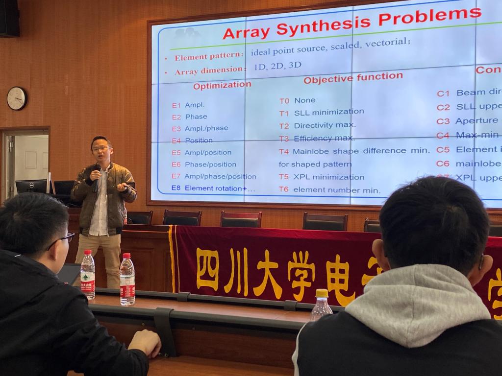 首先,刘颜回教授做了题目为“阵列天线布局及波束综合技术研究”的报告。该报告介绍归纳了阵列天线布局及方向图综合问题的主要类型,并着重介绍了随机优化类算法、数学规划类算法、含阵元互耦的迭代FFT方法、自适应阵列理论等方法在阵列综合问题中的应用及发展。