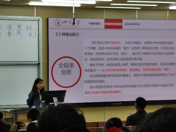活动开始奏响共青团团歌,主持人带领团员庄严宣誓。主讲人朱婧老师就共青团光荣历史、中国共青团性质、中国共青团标致、共青团员的义务和权利、团支部工作、团组织生活会等问题进行了详细的阐述,对在抗击新冠疫情中为祖国做出突出贡献的陈薇院士和钟南山院士的抗疫成果做出详细的介绍并对共青团推优入党、推优具体条件和如何争做一名合格的大学生团员等问题进行了答疑。