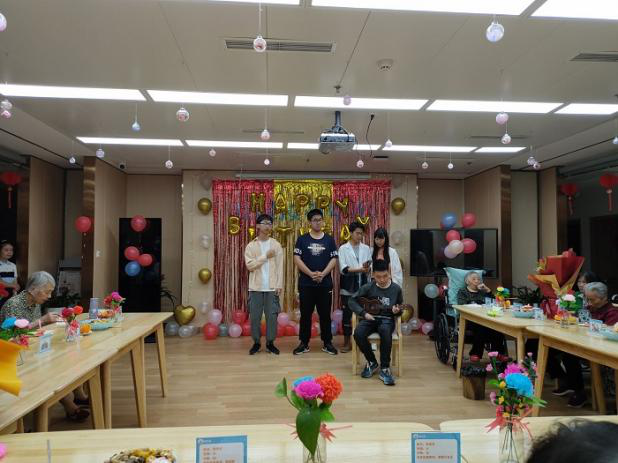 在谭院长致辞后,大家为老人齐唱生日歌,老人在歌曲尾声中许下生日愿望,亲手分好蛋糕,现场氛围温馨而欢快。志愿者们带来了歌曲《烛光里的妈妈》作为母亲节献礼,现场的家属们也即兴表演了节目。