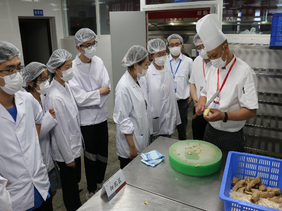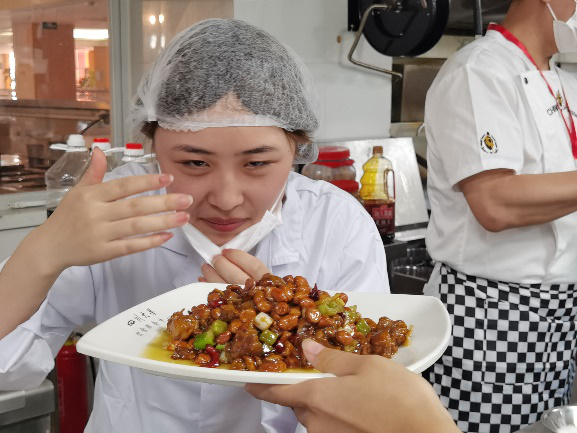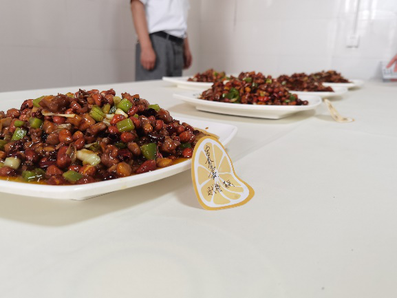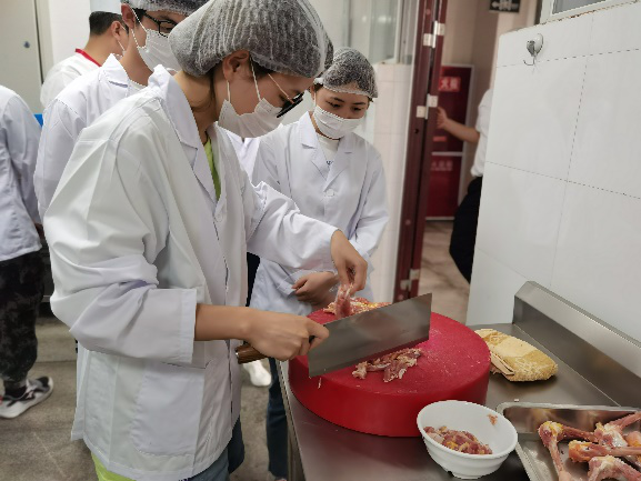 劳动课程课堂的第二阶段是安排学生体验制作宫保鸡丁。活动伊始,饮食中心菜品开发部的李经理便向大家绘声绘色地介绍了宫保鸡丁的由来。在各位工作人员的亲切指导下,学生们三两分组,合作完成食材的准备工作。接下来是烹饪环节,一道看似简单的菜肴在烹饪前却需要经历择菜、清洗、切丁、腌制等多个步骤。